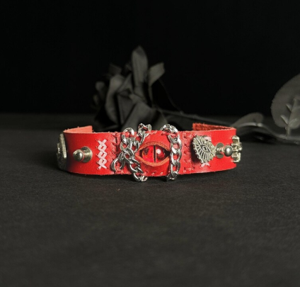 Make a bold and dark statement with the Blood Red Eyeball Leather Cuff, a handcrafted accessory that combines gothic aesthetics, punk attitude, and witchy grunge vibes. Featuring a vivid blood-red eyeball centerpiece, studded spikes, and decorative chains on a premium black leather band, this bracelet exudes mystery, rebellion, and edgy style.