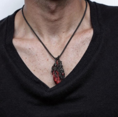 Unveil the beauty of contrast and chaos with the Crimson Wings Necklace, a stunning embodiment of gothic elegance and fallen grace.