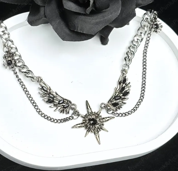 Featuring a black gem star pendant wrapped in intricate angel wings, this piece captures the essence of a celestial being cast from the heavens — powerful, untamed, and breathtaking.
