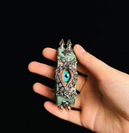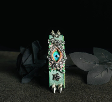 Step into the future of edgy fashion with the Green Eye Spiked Leather Cuff, a handcrafted accessory that fuses cyberpunk aesthetics with punk rebellion. Featuring a vivid green eye centerpiece and sharp metal spikes on a premium black leather band, this bracelet exudes boldness, mystery, and futuristic style.