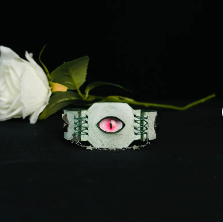 Add a cute yet edgy touch to your style with the Pink Eye Pastel Goth Leather Bracelet, a handcrafted accessory that blends pastel goth aesthetics with playful charm. Featuring a vivid pink eye centerpiece and delicate star charms on a soft pastel leather cuff, this bracelet exudes whimsy, individuality, and subtle dark elegance.