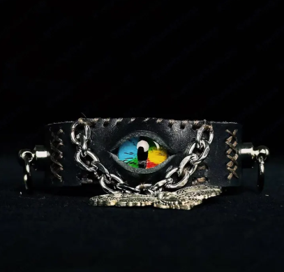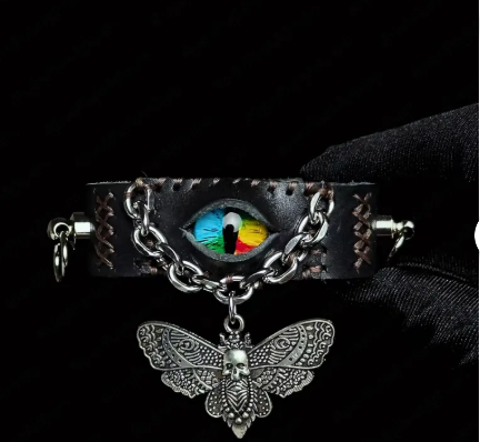Perfect for those who want to stand out with a dramatic, dark fantasy-inspired accessory, the Rainbow Eye Skull Moth Leather Bracelet adds a striking and unforgettable touch to any outfit.