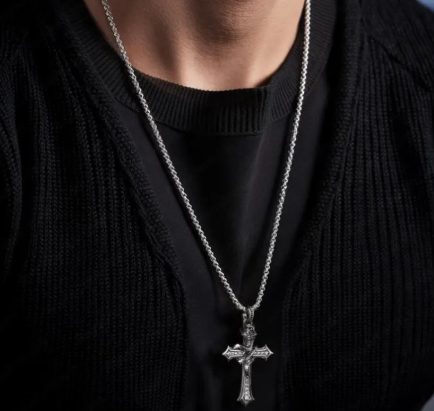Whether layered with other pieces or worn alone, the Serpent Cross Amulet is a statement accessory that enhances any dark, refined outfit.