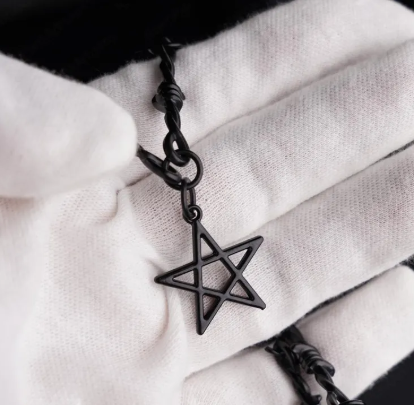 $89.90Embrace your dark side with the Barbed Star Choker, a fierce fusion of gothic symbolism and punk rebellion. Centered around a pentagram pendant wrapped in barbed wire detail, this necklace captures the essence of power, mystery, and untamed spirit.