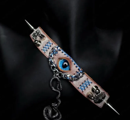 Blue Eye Punk Leather Cuff – Handmade Spiked Chain Wristband