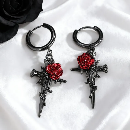Black Thorn Rose Cross Earrings – Gothic Vampire Studs & Dangle Hoops