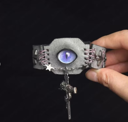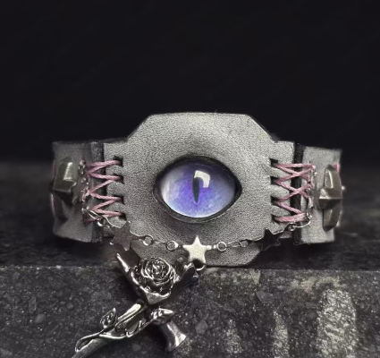 $79.90Make a bold statement with the Blue-Purple Cat Eye Gothic Leather Cuff, a handcrafted accessory that merges gothic elegance with punk fantasy vibes. Featuring a striking blue-purple cat eye centerpiece, along with cross and sword charms on a premium black leather band, this bracelet exudes mystery, power, and edgy style.