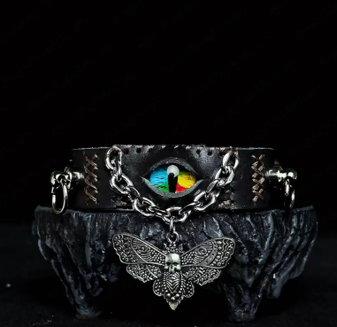 Make a bold statement with the Rainbow Eye Skull Moth Leather Bracelet, a handcrafted accessory that fuses punk rebellion with gothic mystique. Featuring a skull-shaped moth centerpiece with a vivid rainbow eye on a premium black leather band, this bracelet exudes individuality, dark elegance, and edgy charm.