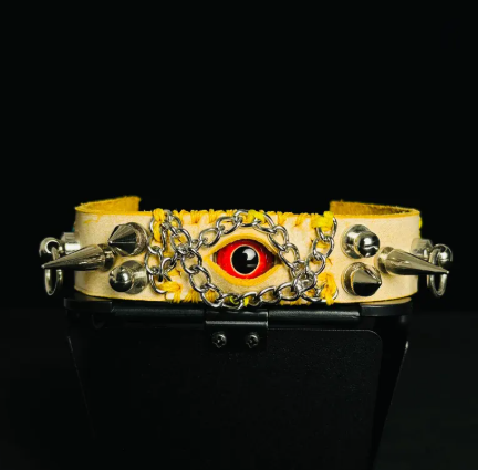 Make a bold statement with the Red Eye Pink Leather Cuff, a handcrafted accessory that blends gothic aesthetics with punk attitude. Featuring a striking red eye centerpiece on a soft pink leather band, accented with metal studs, this bracelet exudes individuality, dark charm, and edgy style.